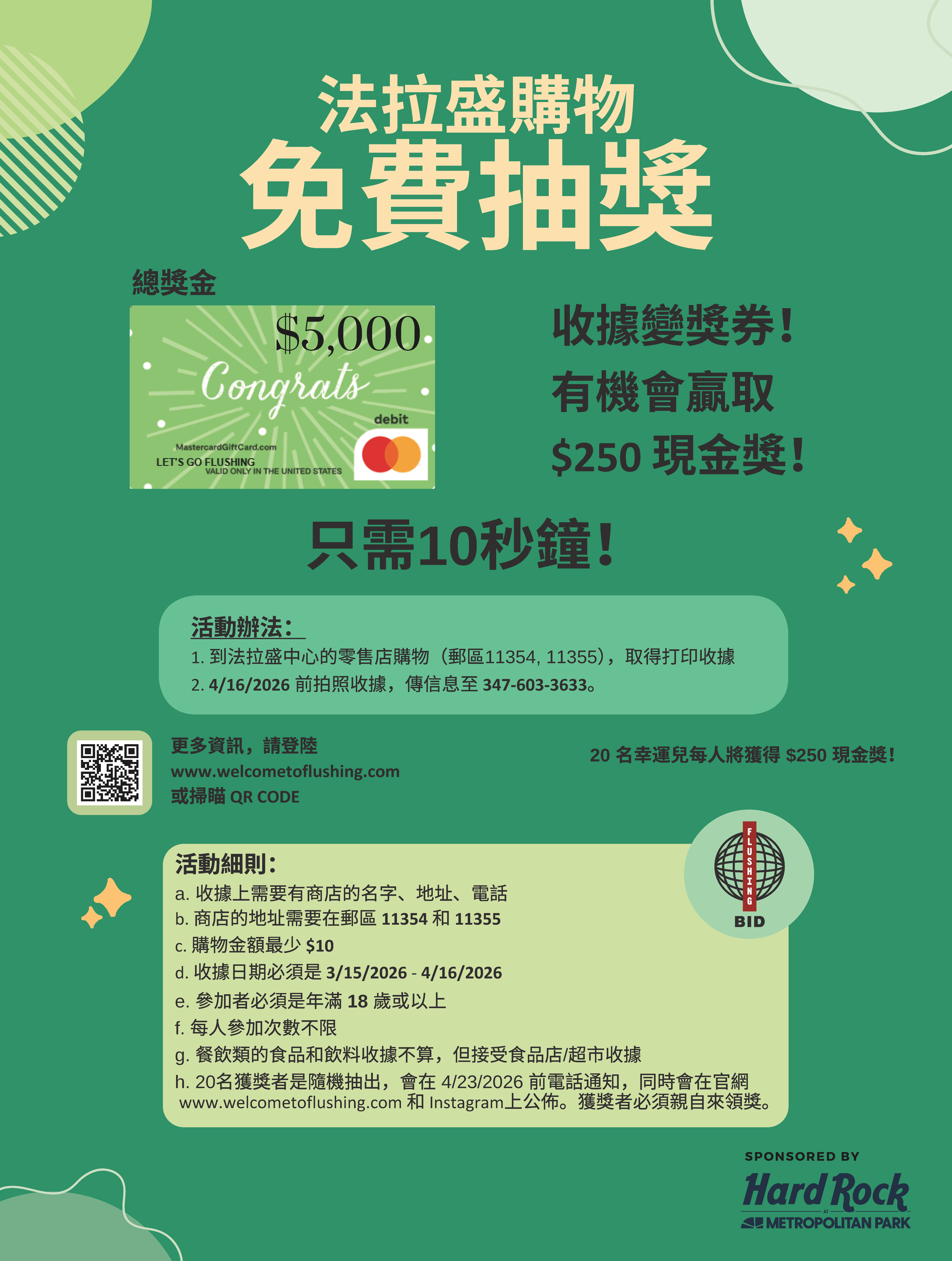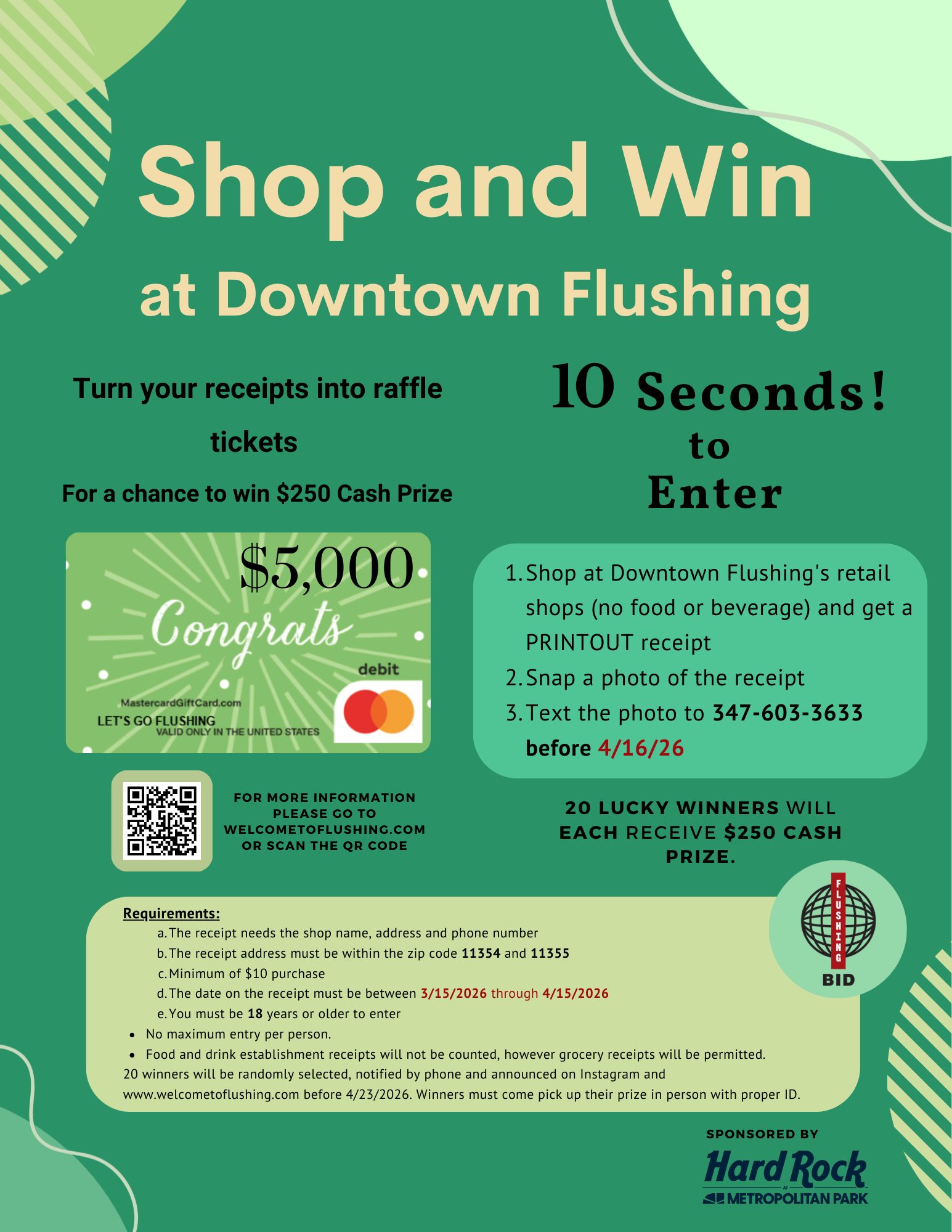 5. Liability Release: By entering, participants agree to release and hold harmless Flushing BID, its affiliates, sponsors, and representatives from any claims, liabilities, or damages arising from participation or prize acceptance.